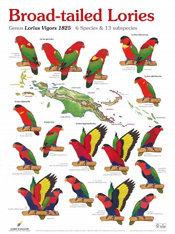 Das Poster "Broad-tailed Lories " mit allen Arten der Gattung Lorius Vigors 1825. Die Illustrationen stammen von Thomas Arndt, einem international bekannten Papageien-Experten.